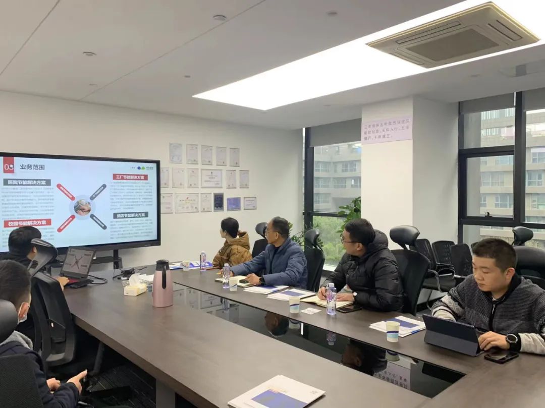双方就节能降碳技术推动产业绿色发展、产业绿色转型等内容进行了交流,同时参观了明莱能源的展厅,详细地了解了明莱能源的节能设备、综合能源管理平台、节能运维服务、项目案例等方面的实践成果。