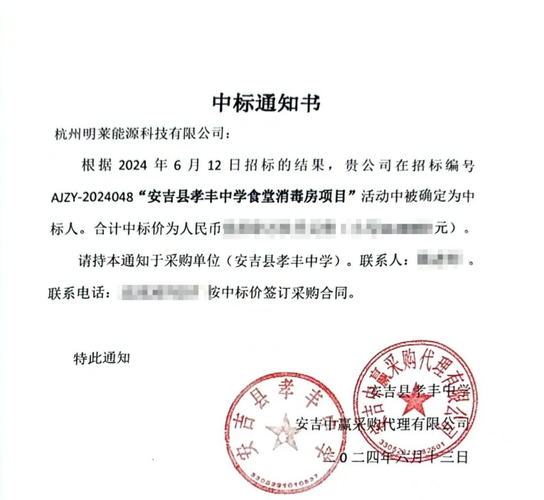 近日,杭州明莱能源有限公司凭借专业的技术实力和丰富的项目经验,成功中标了安吉孝丰中学的消毒房项目。